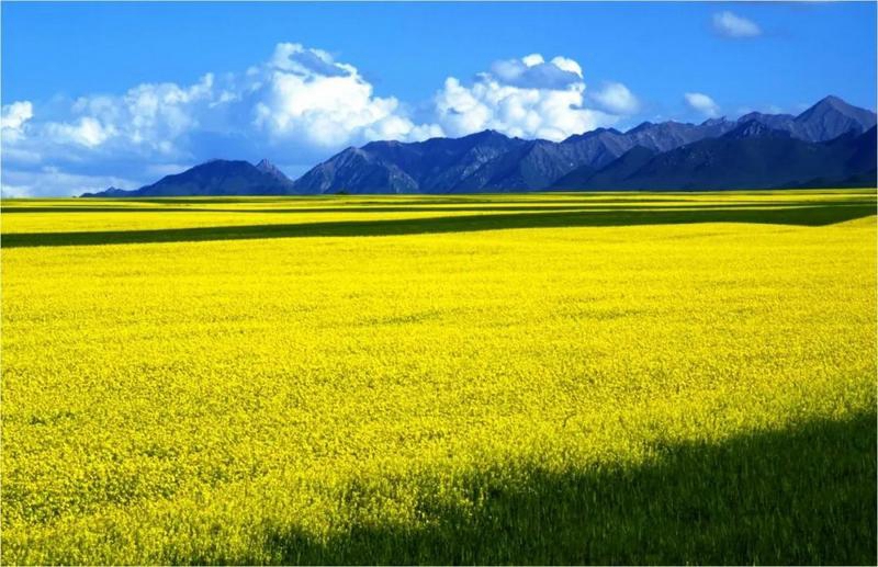 微风阵阵,千里沃野,铺天盖地的油菜花海,连绵起伏,在夏日骄阳的照耀下,铺展成光芒四射、一望无际的黄金地毯。远处山峦起伏 ,白云悠悠 ,雍容华贵的金色在皑皑白雪和炎炎烈日的映衬下,流光溢彩;微风吹拂,阵阵清香令人心醉神迷。
