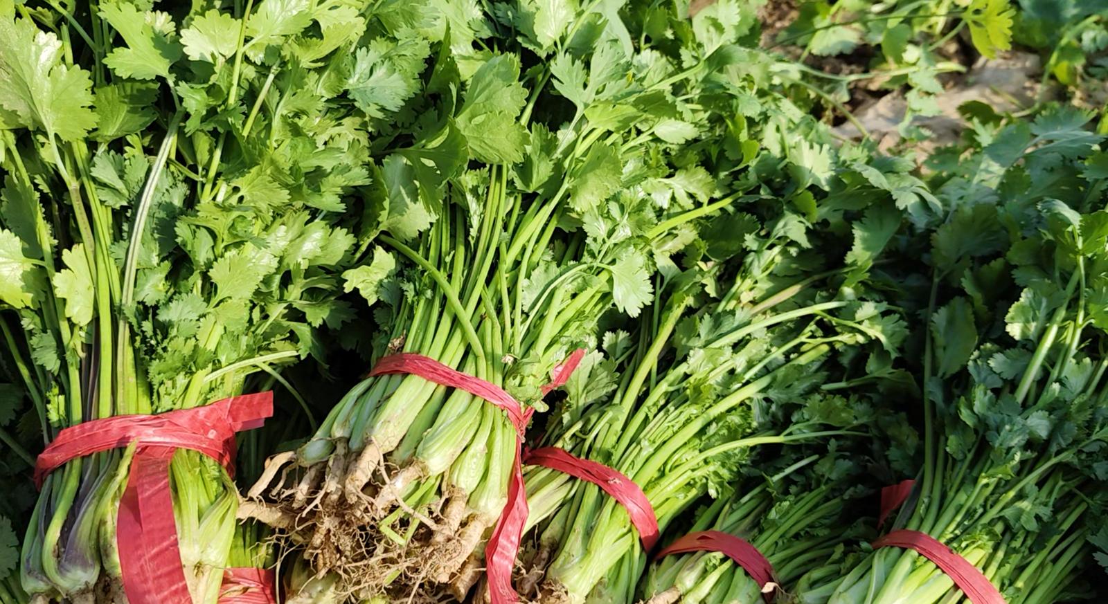 室外寒风凛冽,棚内春色满园。走进东乐镇五墩村片区的钢架大棚内,一片片绿油油的香菜长势喜人。村民们在大棚里收割、分拣、捆扎,有条不紊地进行各种工序,丰收的喜悦洋溢在每个人的脸上。
