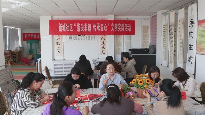 近日,来到新城社区文明实践站,一场以“指尖非遗・传承匠心”为主题的非遗活动如火如荼,居民们围坐在一起,全身心投入。她们有的剪刀轻快,穿梭于红纸间,不一会儿,一幅幅主题鲜明的作品便诞生了,其中“不忘初心、牢记使命”“永远跟党走”等字样的剪纸,在精心雕琢下线条流畅、别具匠心。她们有的指尖灵活飞舞,一边讨论针法技巧,一边精心编织带有时尚元素的饰品,让传统手工焕发出新活力。他们有的发挥创造力,将手中的彩泥塑造成小鱼、小鸭等可爱的小动物,以及葫芦、如意等象征吉祥的物品,每一件作品都饱含着对美好生活的期待。