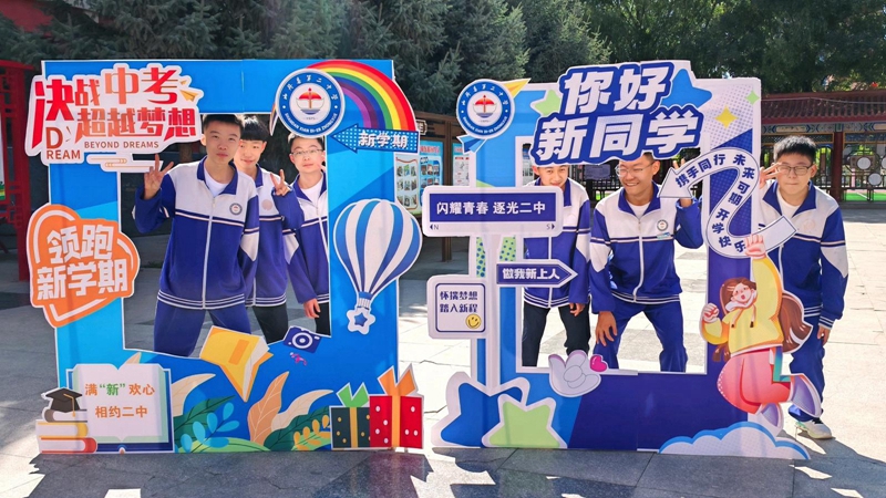 开学第一天,山丹县第二中学的教学楼前格外热闹。这里专门设置了以“逐梦中考”为主题的打卡区,背景板上“全力以赴,未来可期”的标语格外醒目,励志歌曲在现场循环播放,不少同学驻足打卡,脸上满是昂扬斗志。