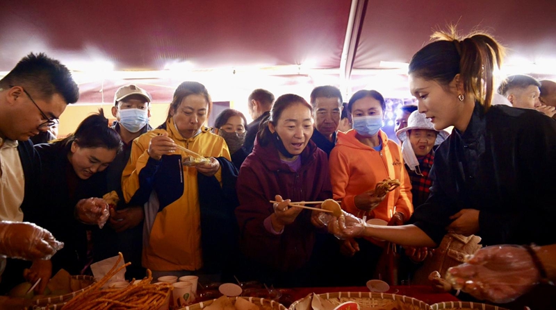漫步巷中,阵阵诱人的香气将游客们自然引至“品特色美食·展丹城风采”长桌宴区。八桌各具特色的佳肴整齐陈列,由八个乡镇精心准备的八十余道地方美食令人目不暇接。山丹月饼的甜香与手抓羊肉、黄焖羊肉等本地特色羊肉美食的醇厚香气在空气中交织,勾起了无数食客的味蕾。来自各地的游客穿梭在长桌间,细细品味着每一道特色菜肴,不时发出赞叹之声。