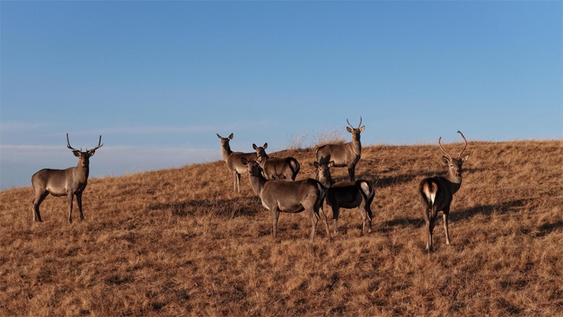 2025年11月11日,在甘肃山丹马场的草原山地间,马鹿、狍鹿、岩羊等野生动物或嬉戏觅食,或闲庭信步,灵动身影在蓝天草原的映衬下,铺展开一幅充满野性生机的生态画卷。