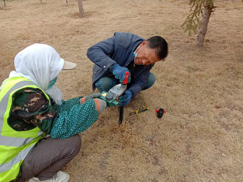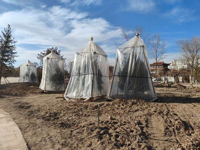 科学防寒保暖,确保植物安全越冬。针对山丹县冬季寒冷干燥的气候特点,采取多项措施保障植物安全越冬。对新栽植及不耐寒树木采用草绳缠绕、防寒布包裹等方式进行保温。对部分灌木搭建防风障,减少寒风对植物的直接伤害。在土壤封冻前完成冬季灌溉,保证植物冬季水分需求。