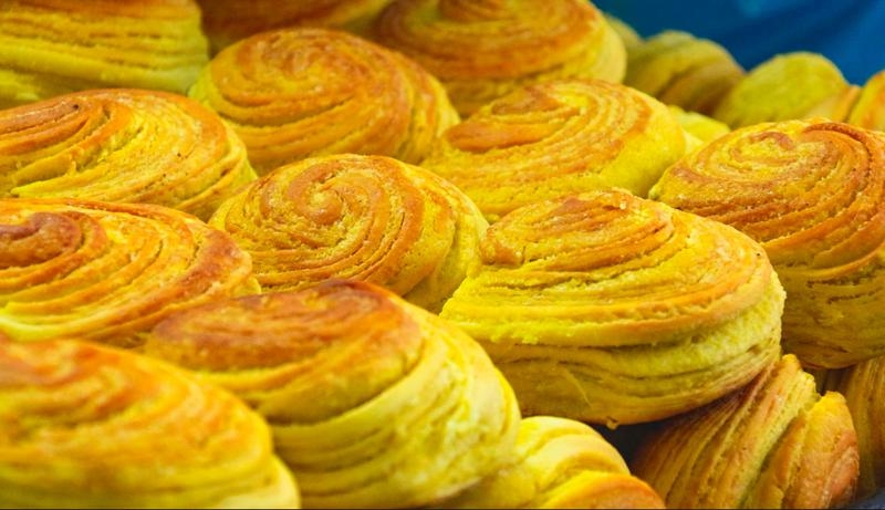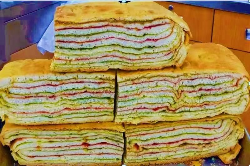 不同于寻常面食的单调,山丹馍馍品类繁多,蒸、烤、炸、烙四大类,四十余种单品,每一款都兼具颜值与风味,藏着独特的民俗寓意。腊月的灶台前,主妇们各展身手,白花花的面团在指尖被赋予生命:糖花子是年馍中的“颜值担当”,发面掺上油面、糖面擀成薄饼,切成方块后将边沿剪成梳齿状,卷成云头模样,入油锅缓煎慢炸,出锅后金黄发亮,酥脆香甜,六瓣造型似山丹花,寓意六六大顺,八瓣造型则承载着吉祥圆满的期许,是春节待客、走亲访友的必备佳品;窝酥子则是烤馍中的佼佼者,包入油面的发面擀饼切块、卷制成型,经高温烤制后,外脆里酥,咬一口直掉渣,麦香与油香在舌尖层层绽放;千层饼层层叠叠,每一层都抹上胡麻油与香料,蒸制后松软入味,寓意日子蒸蒸日上;还有那被誉为“草原面包”的烧盒子,将发酵好的面团放入特制铁盒,埋入柴草余火中煨烤,出炉后焦黄喷香,外焦里嫩,便于存放,是牧民们放牧的干粮,也是馈赠亲友的特色好物。
