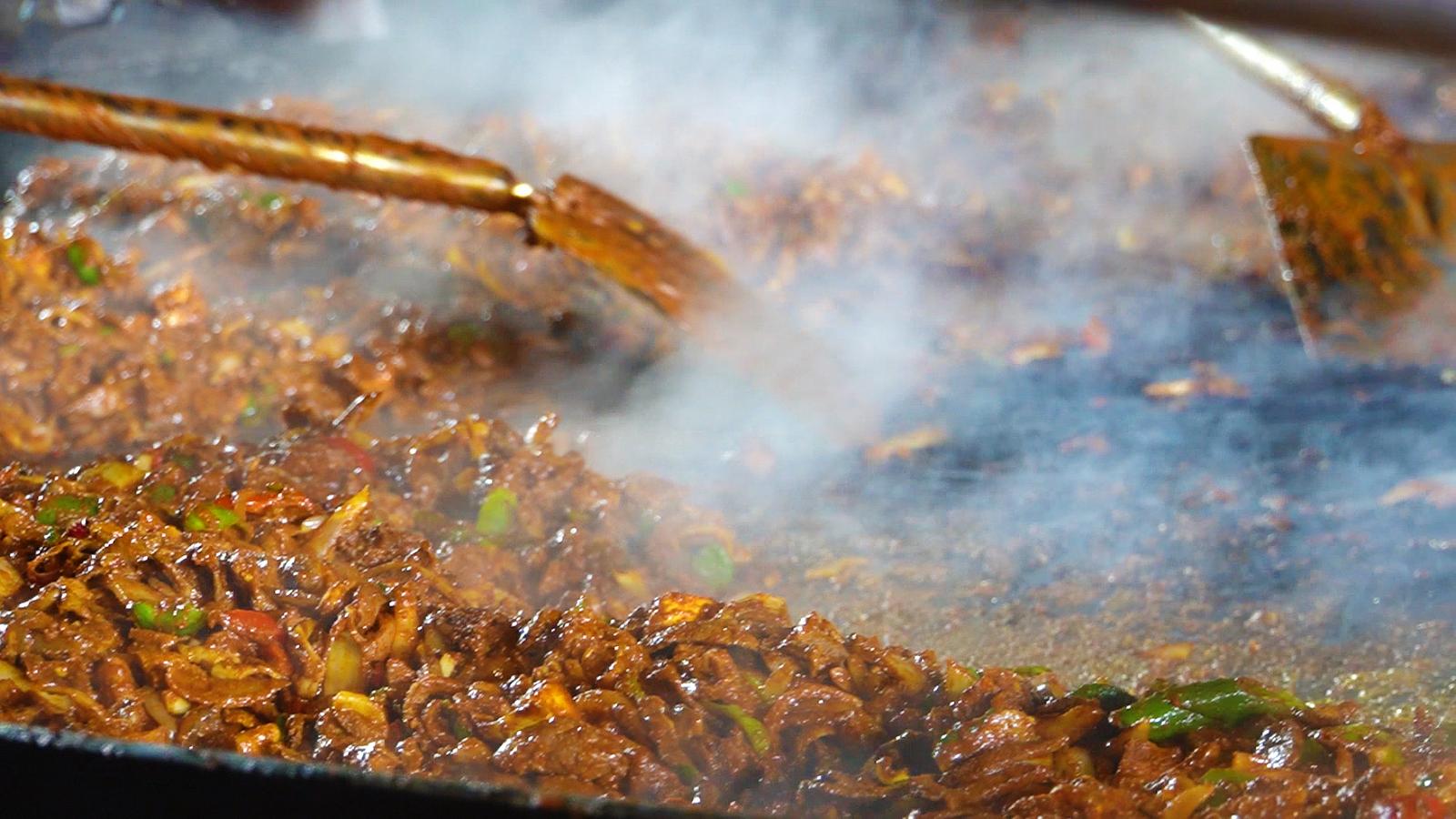 厨师们挥动着铁铲翻炒