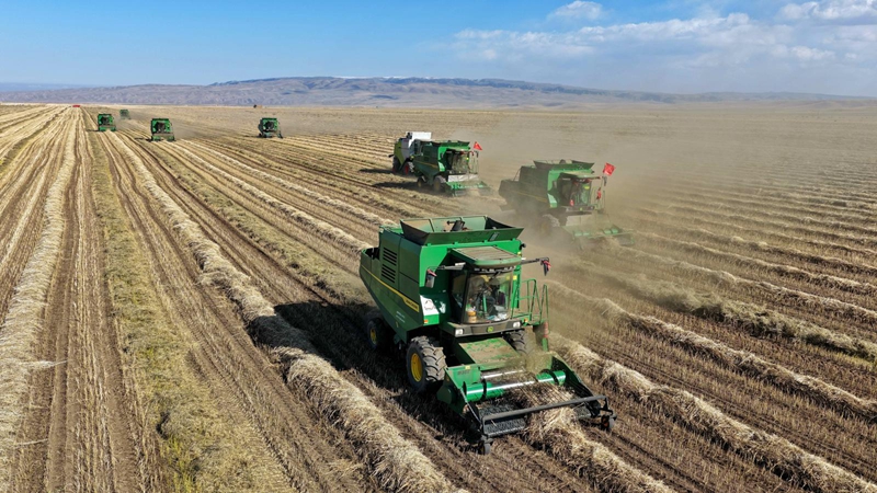位于河西走廊中部的山丹马场,海拔高、气候冷凉,得天独厚的自然条件使其成为高原夏菜和优质粮油作物的重要产区。时下,油菜等作物相继成熟,连片农田宛如金色织毯,铺展至祁连山脚下。收割机群开足马力,有序推进,一次性完成作物的收割、脱粒和秸秆处理,大大提升了收割效率。
