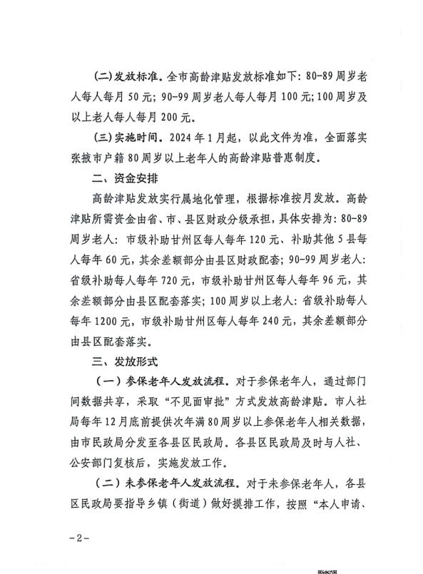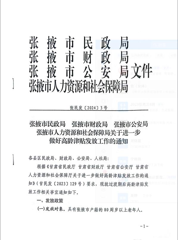 张掖市民政局 张掖市财政局 张掖市公安局张掖市人力资源和社会保障局关于进一步做好高龄津贴发放工作的通知 张民发〔2024...pdf