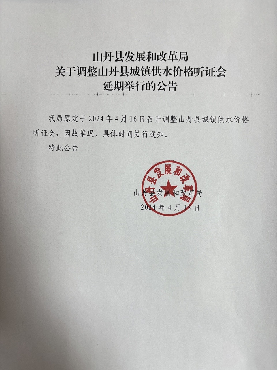 关于调整山丹县城镇供水价格听证会延期举行的公告