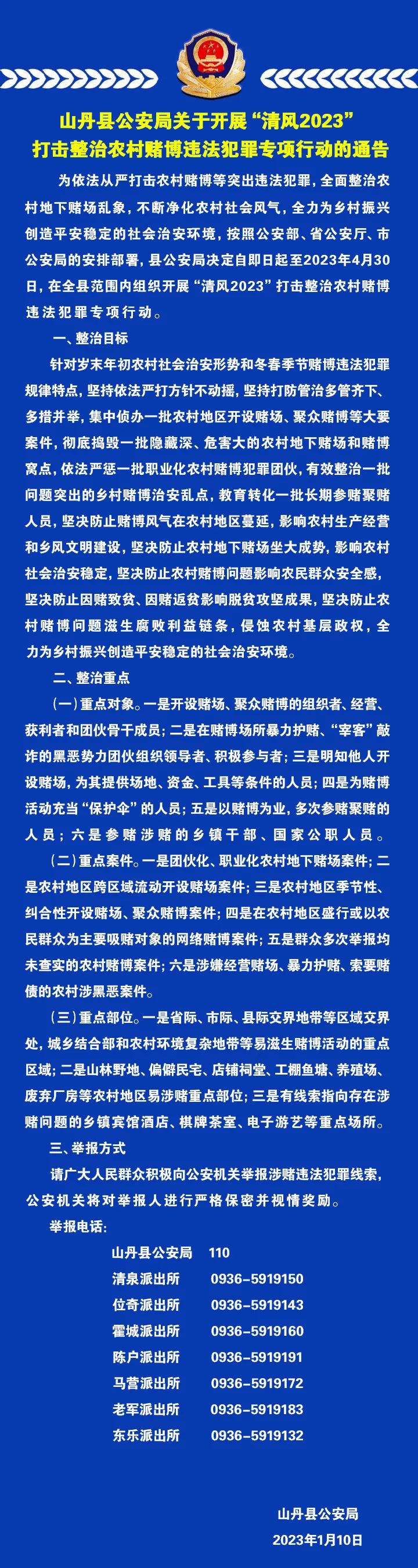 山丹县公安局关于开展“清风2023”打击整治农村赌博违法犯罪专项行动的通告