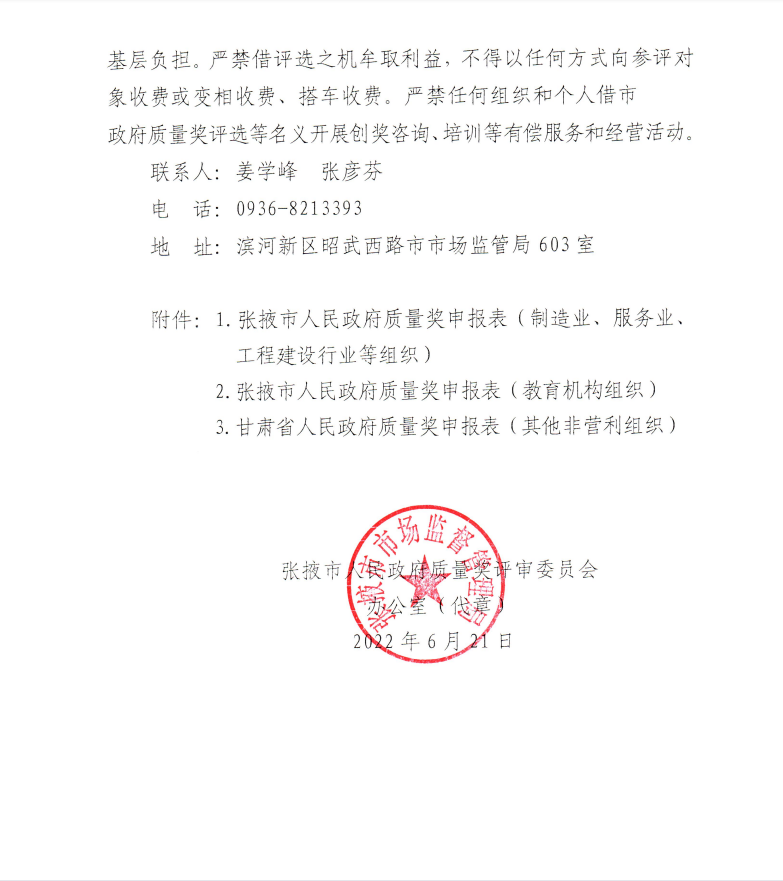 | 索引号 | 6207250007/2022-00012 | 发文字号 | 张质量奖评审办发[2022]1号 |