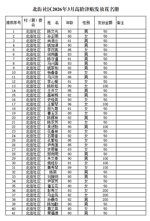 北街社区2026年3月高龄津贴发放花名册