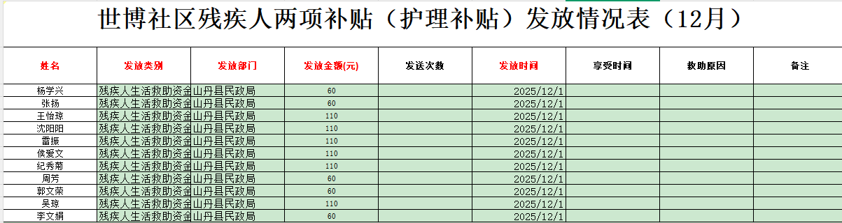 世博社区2025年12月残疾人两项补贴发放花名册(护理补贴)