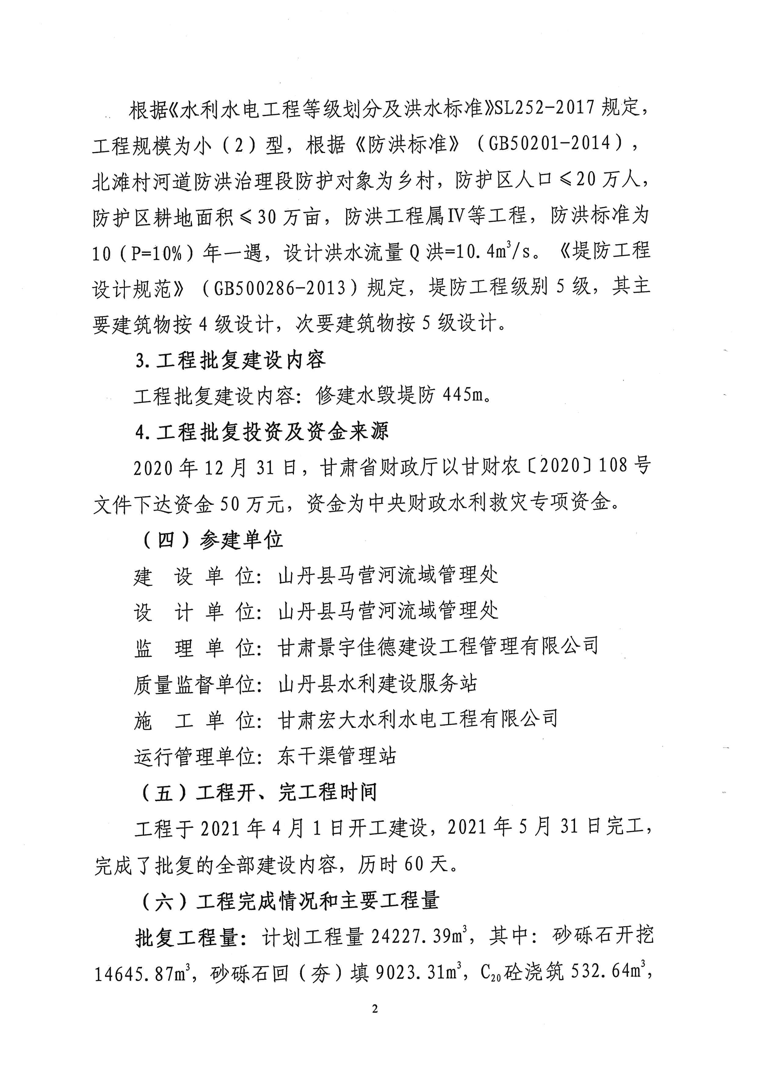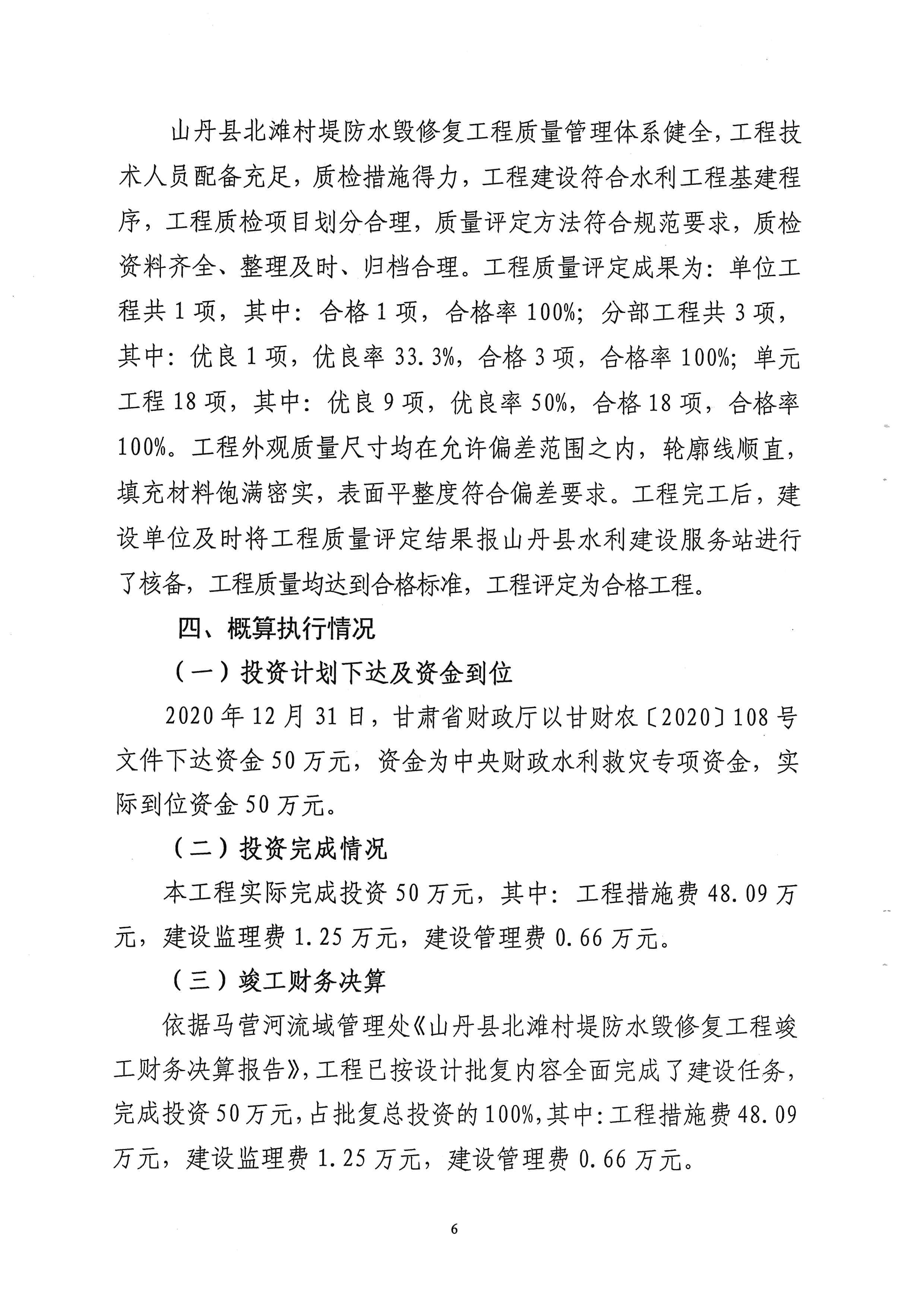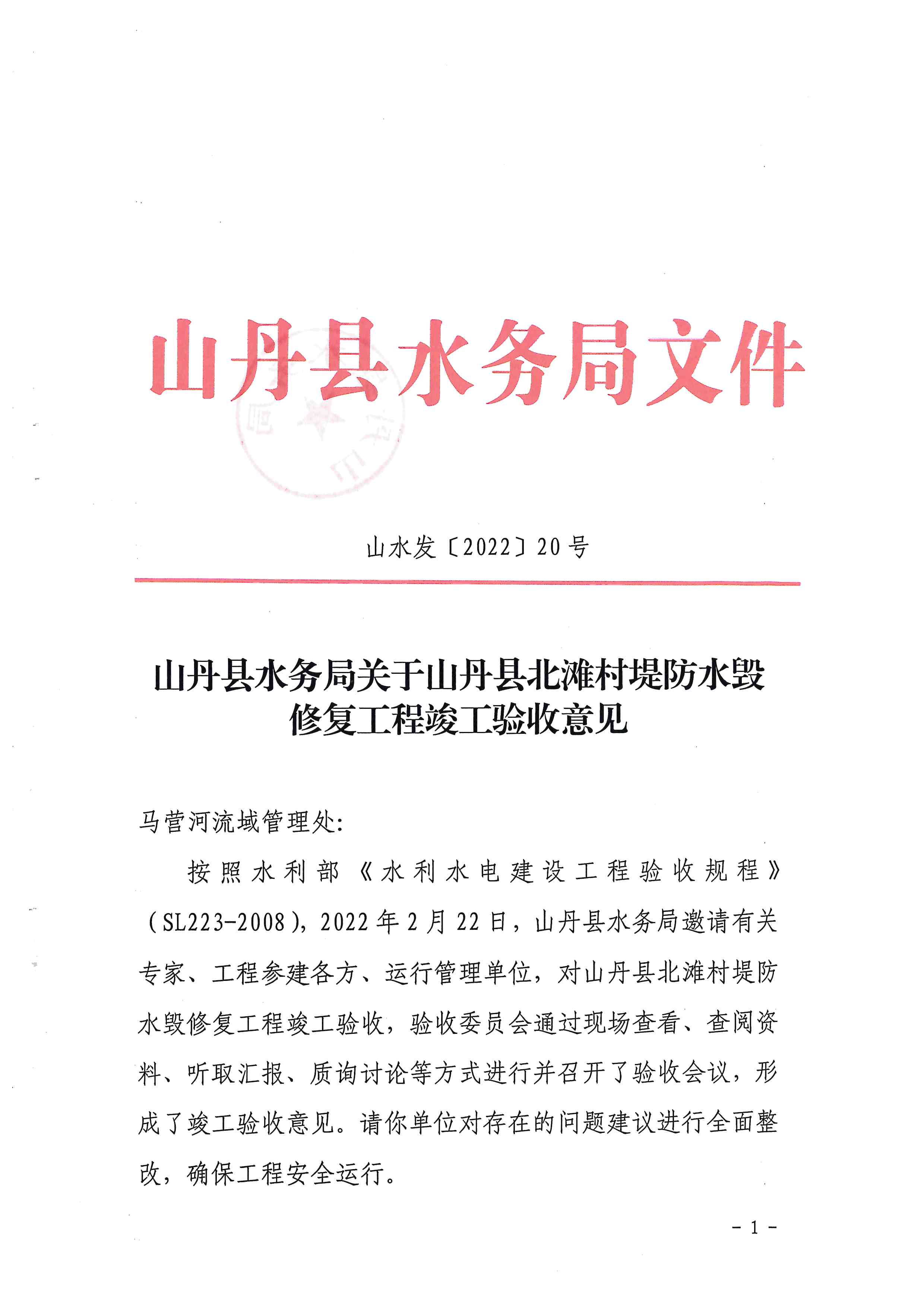 山丹县水务局关于山丹县北滩村堤防水毁修复工程竣工验收意见